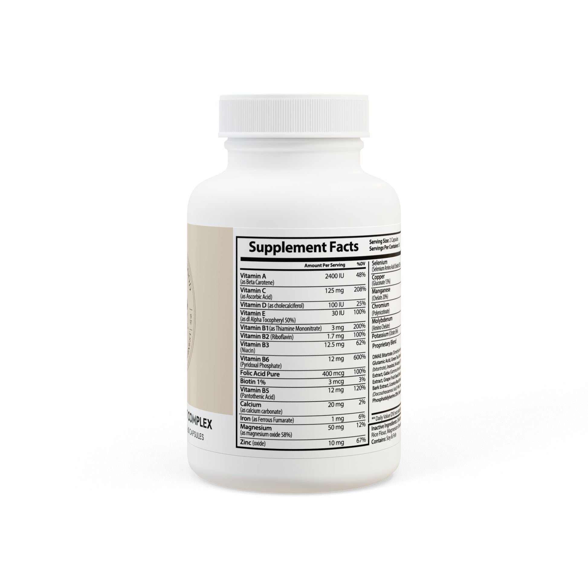 - Ingredients: Vitamin A (as Beta Carotene), Vitamin C (as Ascorbic Acid), Vitamin D (as cholecalciferol), Vitamin E (as dl Alpha Tocopheryl 50%), Vitamin B1(as Thiamine Mononitrate), Vitamin B2 (Riboavin), Vitamin B3 (Niacin), Vitamin B6 (Pyridoxal Phosphate), Folic Acid Pure, Biotin, Vitamin B5 (Pantothenic Acid), Calcium (as calcium carbonate), Iron (as Ferrous Fumarate), Magnesium (as magnesium oxide 58%), Zinc (oxide), Selenium (Selenium Amino Acid Chelate 0.2%), Copper (Gluconate 13%), Manganese (Chelate 20%), Chromium (Polynicotinate), Molybdenum (Amino Chelate), Potassium (Citrate 36%), DMAE Bitartrate (Dimethylaminoethanol), L Glutamine, Glutamic Acid, Green Tea Extract, Bacopa Extract, Choline (bitartrate), Inositol, N-Acetyl L-Tyrosine, Bilberry Fruit Extract, Gaba (Gamma Aminobutyric Acid), Grape Seed Extract, Grape Fruit Seed Extract, Olive Leaf, Cinnamon Bark Extract, Licorice Root Extract, Boron (Citrate), DHA (Docosahexaenoic Acid) 14%, Vanadyl Sulfate 19%, Phosphatidylserine 20%, Huperzine A. Inactive Ingredients: Cellulose (Vegetable Capsule), Rice Flour, Magnesium Stearate, Silicon Dioxide. Contains: Soy & Fish